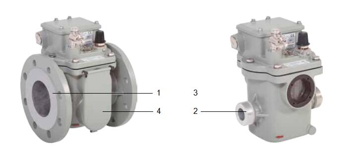 殼體是由耐氣候變化的鑄鋁合金制成,表層已涂色. 依照結(jié)構(gòu)設(shè)計(jì)形式可分為法蘭盤(圖3中1)連接或螺紋連接(圖3中2). 對(duì)殼體的變型品種選項(xiàng)將在下文第5點(diǎn)(單浮子瓦斯繼電器)和第7點(diǎn)( 雙浮子瓦斯繼電器)中加以說明. 其他選項(xiàng)歡迎垂詢.