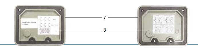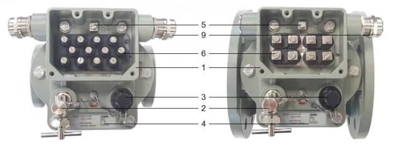 頂蓋是由耐氣候變化的鑄鋁合金制成,表層已涂色. 頂蓋部件上部有一個(gè)接線盒(圖4中1),在接線盒前面有一個(gè)放氣閥(圖4中2)和一個(gè)用悶蓋螺母(圖4中3)覆蓋的測(cè)試按鈕,同時(shí)上面還附有一個(gè)測(cè)試按鈕操作說明標(biāo)牌(圖4中4). 接線盒中除了有一個(gè)接地點(diǎn)(圖4中5)外,頂蓋底板內(nèi)還裝有電力引線端子(圖4中6). 通過電力引線端子的數(shù)量可以決定涉及干簧管類型與數(shù)量的開關(guān)系統(tǒng)的布線配置.